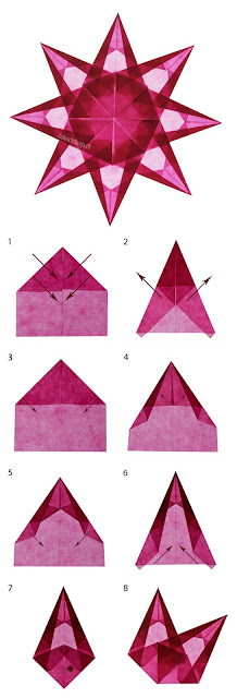 Estas estrellas se elaboran con papel encerado, un papel semitransparente de 42gr, restistente para poderlo manipular con facilidad y con un aspecto brillante cuando es iluminado. Las propiedades del papel lo hacen especialmente interesante para elaborar las estrellas sobre la mesa de luz, ya que así se pueden apreciar los efectos geométricos y las mezclas de colores que se producen con la luz (igual que ocurre cuando las colgamos en las ventanas).
