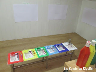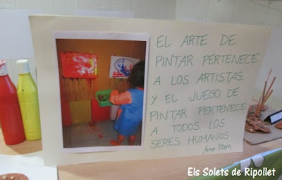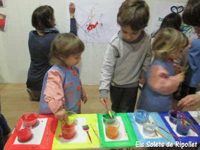 Enero es uno de los meses más fríos del año, los días son más cortos y la oscuridad cae muy pronto cada tarde, por eso pensamos que poner un poco de color podía aportar un poco de alegría a la estación más fría del año. Para ello decidimos crear un espacio de arte inspirado en el taller de pintura que Arno Stern creó hace muchos años, situando una mesa estrecha en el centro de la sala en la qual solo se depositaban los pinceles, el agua y la pintura. Así pues, los dibujos no se pintarían en la mesa, sinó que los lienzos se dispondrían en las paredes de la sala.